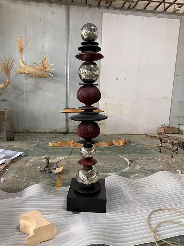 The mix of solid wood and metal materials enhances both the artistic value and durability, offering a striking visual appeal that elevates any environment. Perfect for project-based clients, this sculpture is fully customizable in size, color, and finish.
