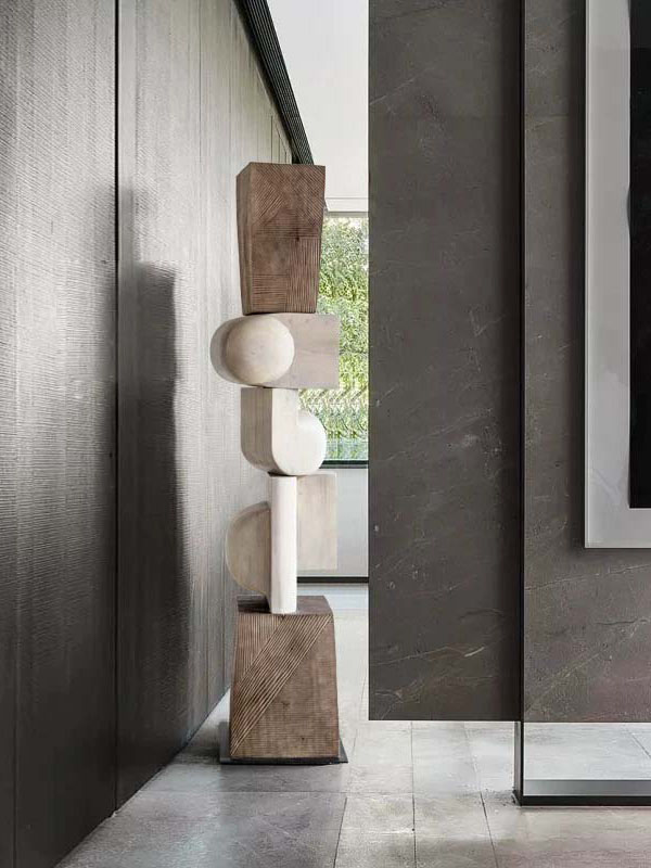 The contrast between natural wood and smooth neutral finishes enhances its sculptural presence while maintaining a minimalist aesthetic.